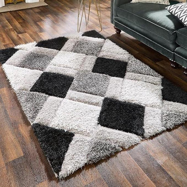 Handcrafted Grey & Black Geometric Shaggy Carpet